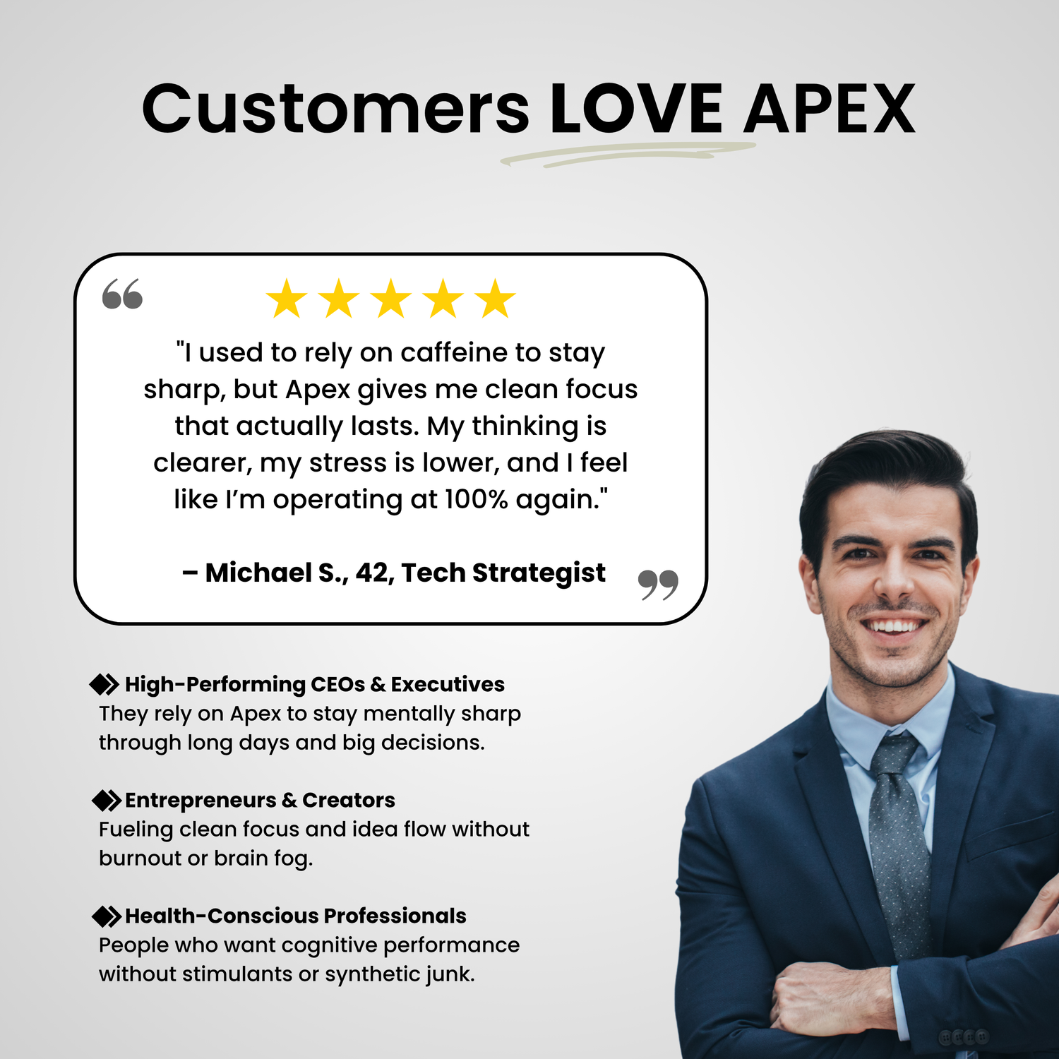 "Apex isn’t just a supplement — it’s a tool. I feel more efficient, less distracted, and able to execute ideas faster than ever before."