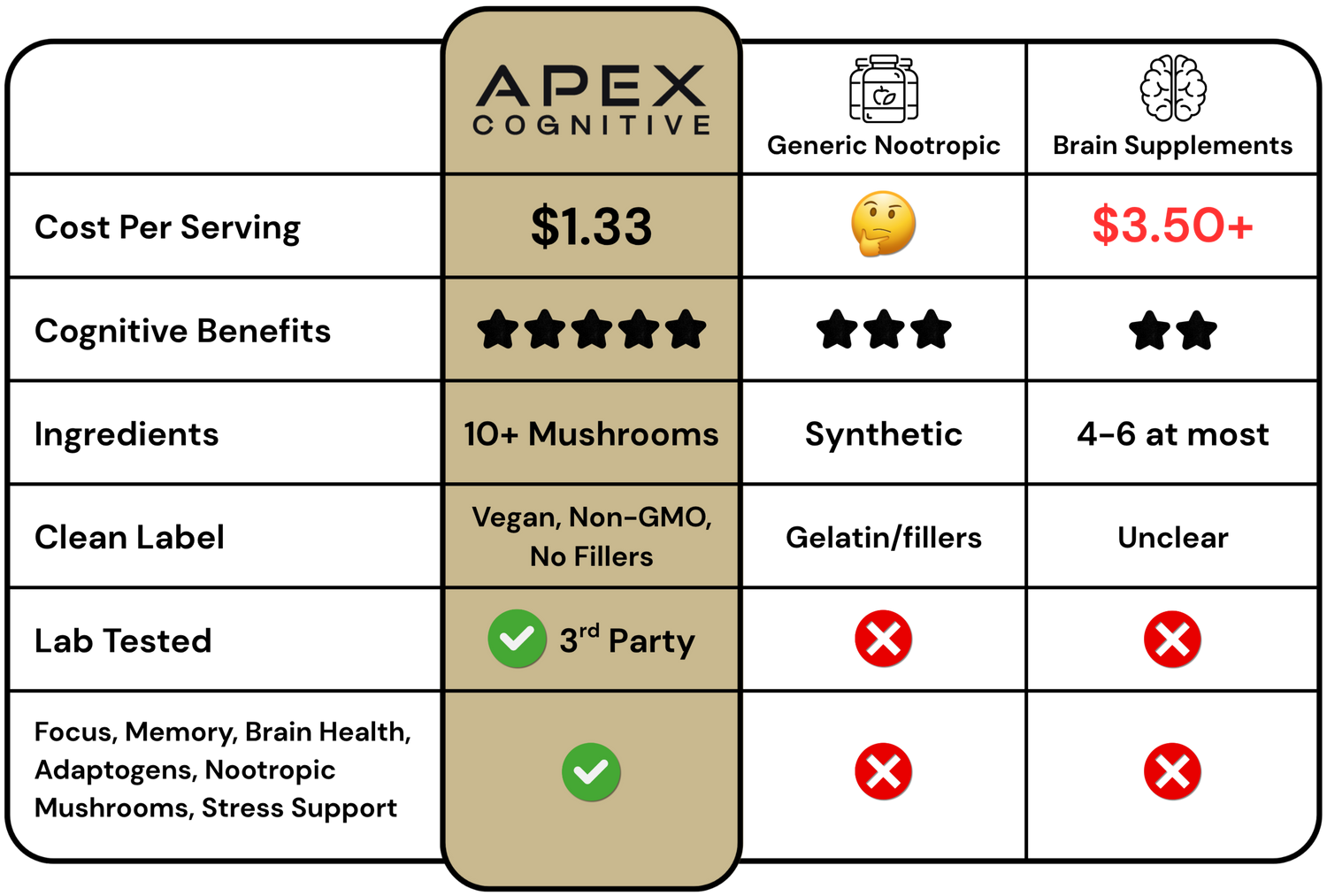 Most brain supplements are either single ingredients that don't do much, or loaded with stimulants that make you feel wired. APEX combines 10 powerful mushrooms that work together to target everything - memory, focus, mental energy, and mood. You get comprehensive cognitive support that makes you feel genuinely sharper and more mentally resilient, not just temporarily stimulated.