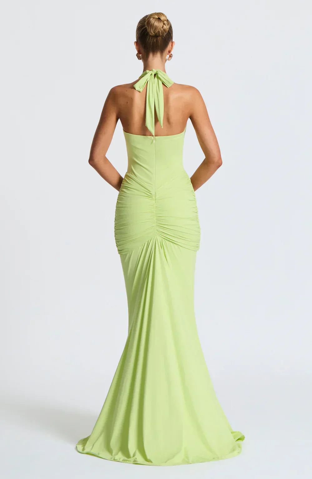 Turn heads in the Lyra Maxi Dress – now in a vibrant lime hue that commands attention. Designed in slinky jersey for a smooth, body-skimming fit, it features a plunging halter neckline with luxe U-wire detail and elegant gathering throughout. The full skirt flows into a dramatic train, while the front-draped panel adds movement and modern flair.